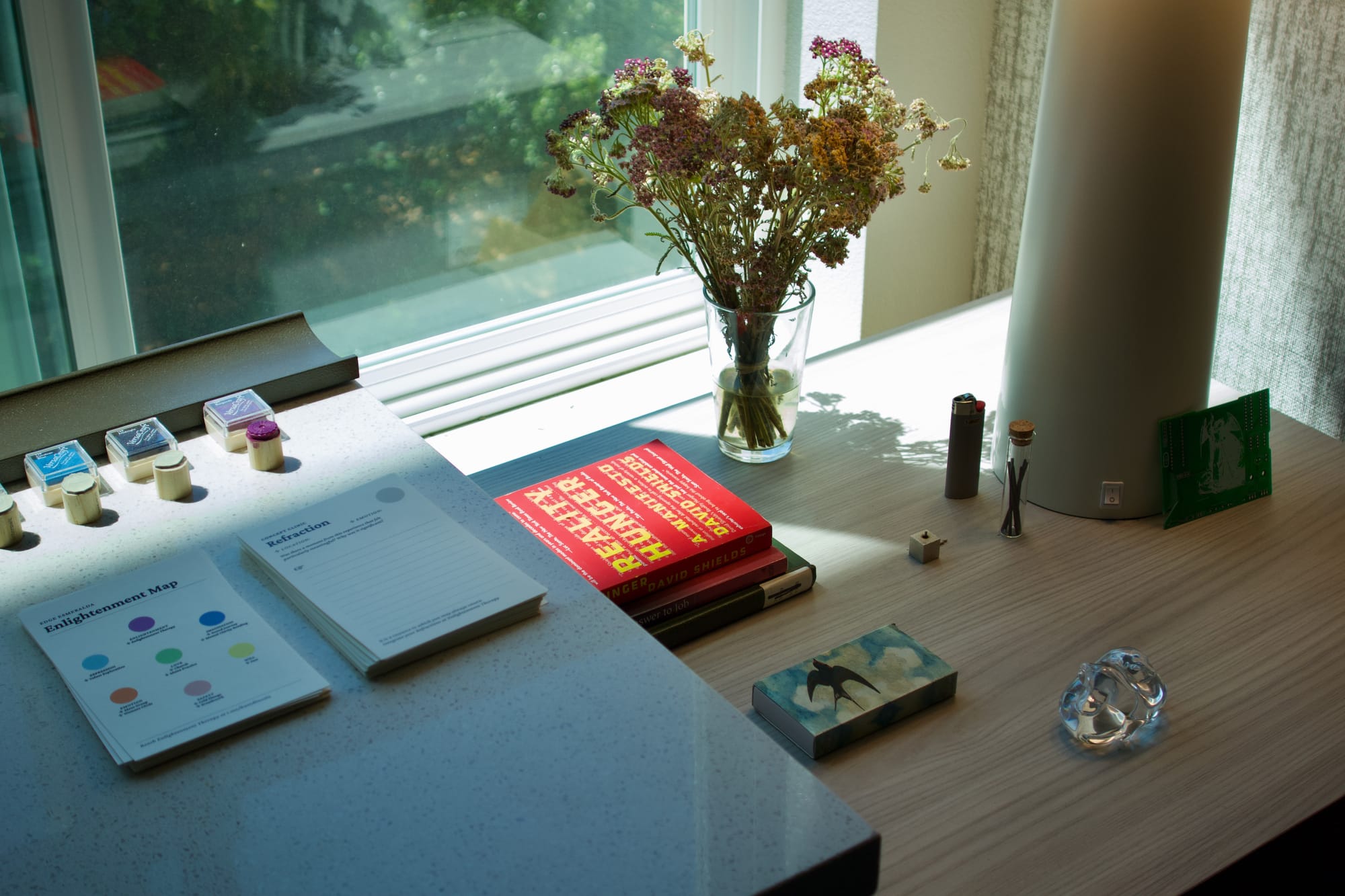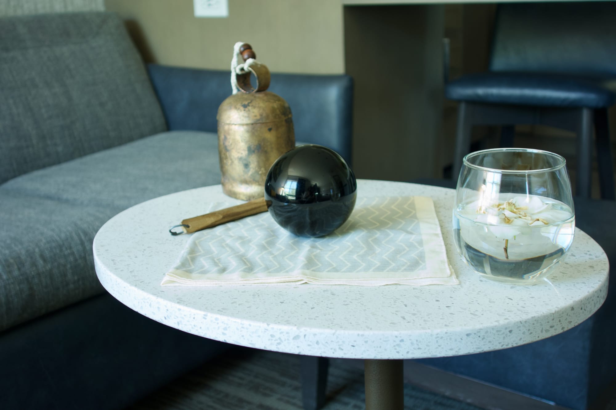 We ended up having to run Enlightenment Therapy out of my hotel room. It wasn’t ideal, but luckily I've been traveling with a bunch of cute items, so we were able to transform the room into a calm and homey place. The bell, a Christmas gift from my parents last year, was a key element. We used it at the beginning and end of every session to demarcate our relationship as Edge Citizens from our full focus on the client in a session.