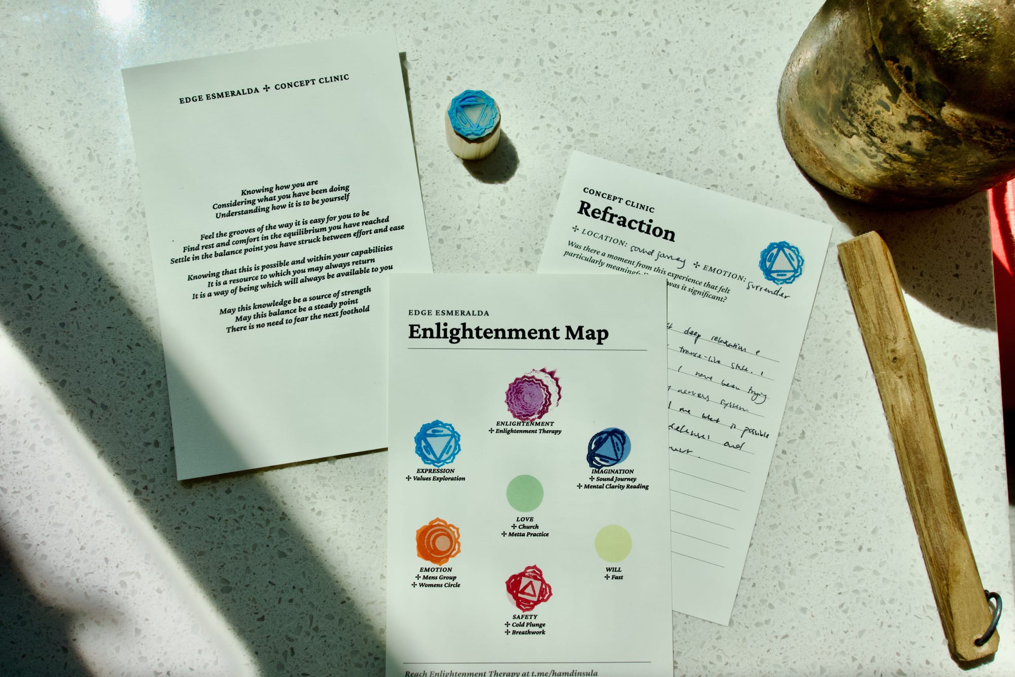 Because of Johnny and Hamdin’s Enlightenment Therapy practice, we themed our clinic around light. I had already invited several practitioners, and my original idea was to have people able to visit different physical resources located across town. Therapy services, the sauna and cold plunge, a church, and workshops in more of a yoga studio type of space would all be places where inner resources can be developed. Johnny and Hamdin then came up with the idea of relating this to the color spectrum and the chakra system.