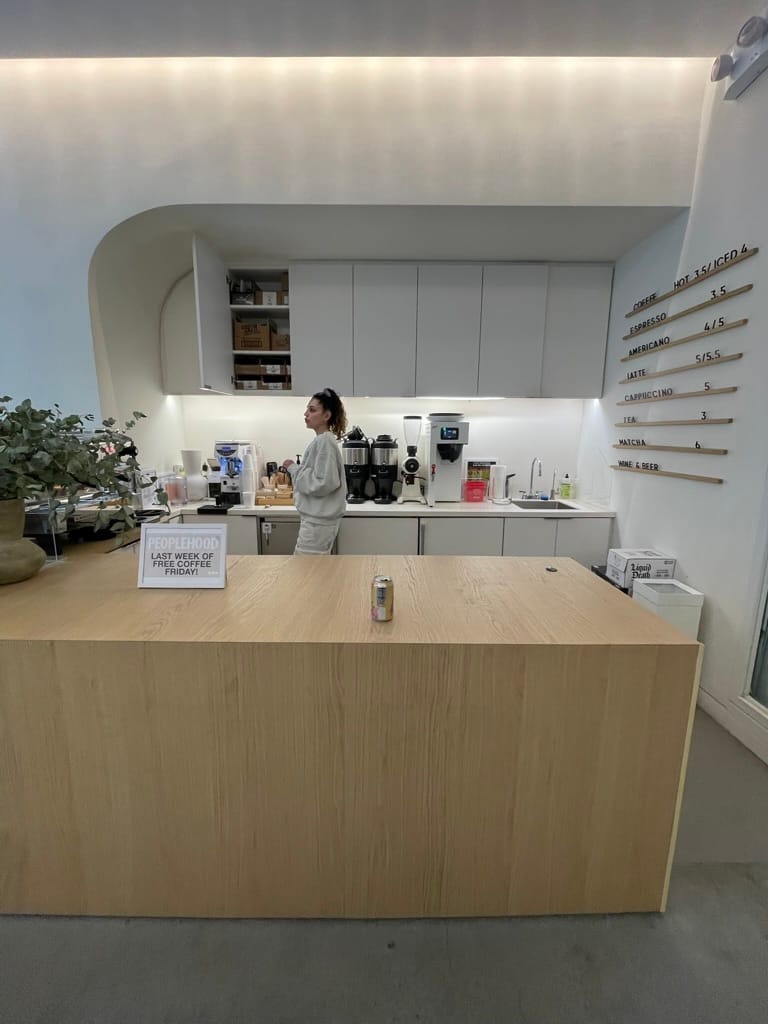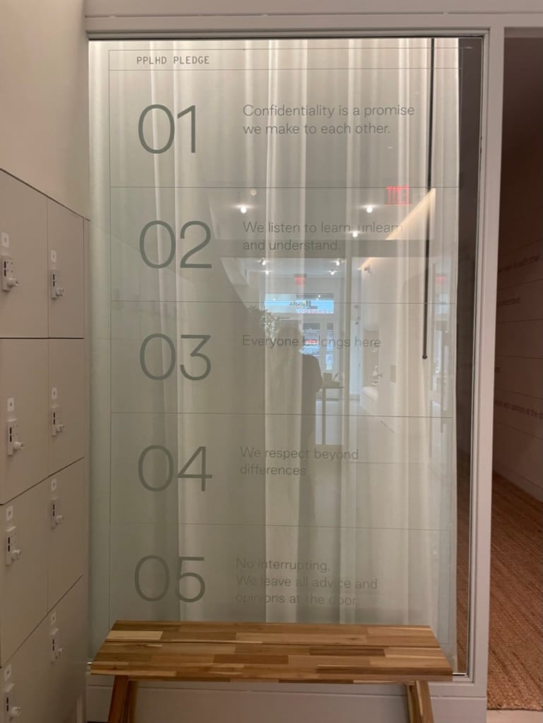 I arrive at Peoplehood’s Chelsea offices and am greeted by a cheerful young woman. She starts a conversation with me easily, telling me that she is studying to be a social worker and is in the second year of her degree. She says that there will only be four people at today’s Gather, and that she will join as one of them. I decline her offer of coffee and go put my things into a combination locker. The interior style of Peoplehood is white and tan, with large text printed on the wall, serving as a reminder that Peoplehood is created by the founders of Soulcycle. It is tasteful but bland. I return to the coffee counter and accept a sparkling water, grateful for the free drinks. I’m still confused as to who will lead our Gather today, until a bouncy small woman in Air Jordans opens the door. This is Gab. Her vibe and attitude are unmistakeably that of an Angeleno.