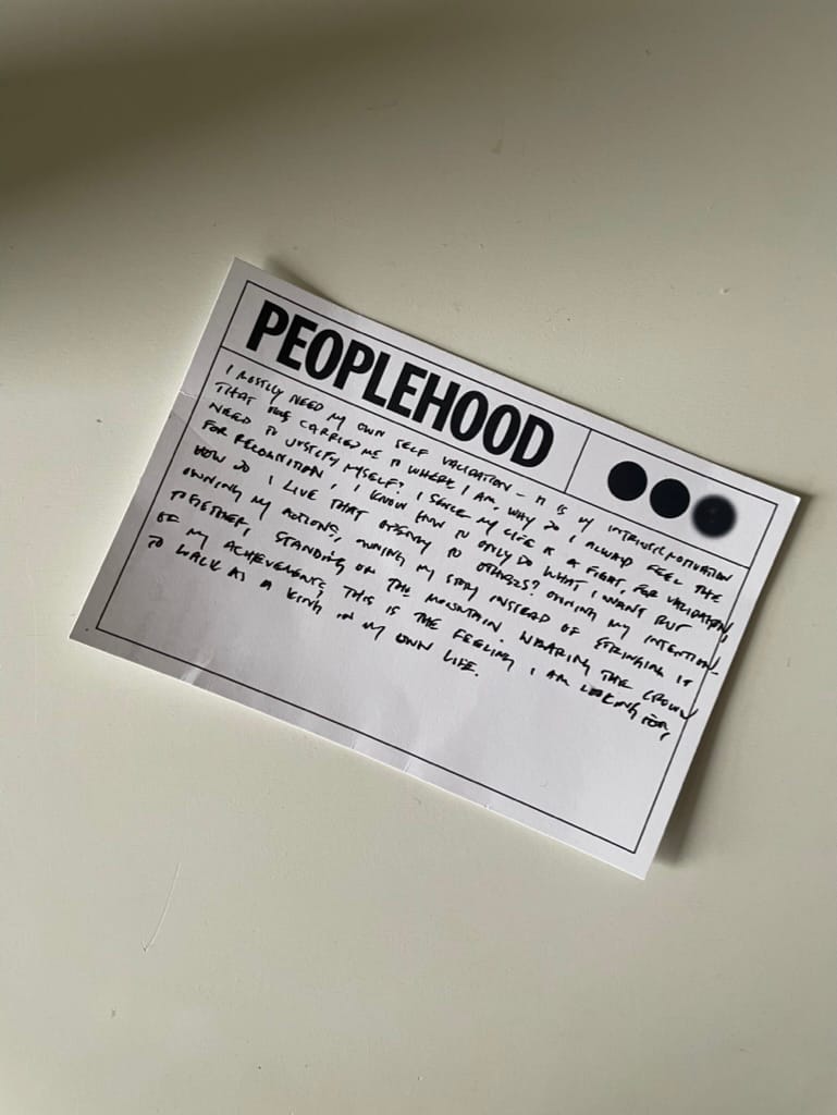 In my first Gather, we introduce ourselves in a round, and answer a question to get in the mood: how are we really doing? This is one of a few questions that Peoplehood reliably uses to open people up. Next, Gab introduces the theme of validation. We all reach for a card and a felt pen from the table, and begin by journaling on this topic. I immediately know what I want to think about: I’ve been reflecting on the way I fail to stand up for my own achievements. Sometimes I feel like I’m fighting for recognition, that I’m expecting not to get it—I write down that the validation I most need is my own.